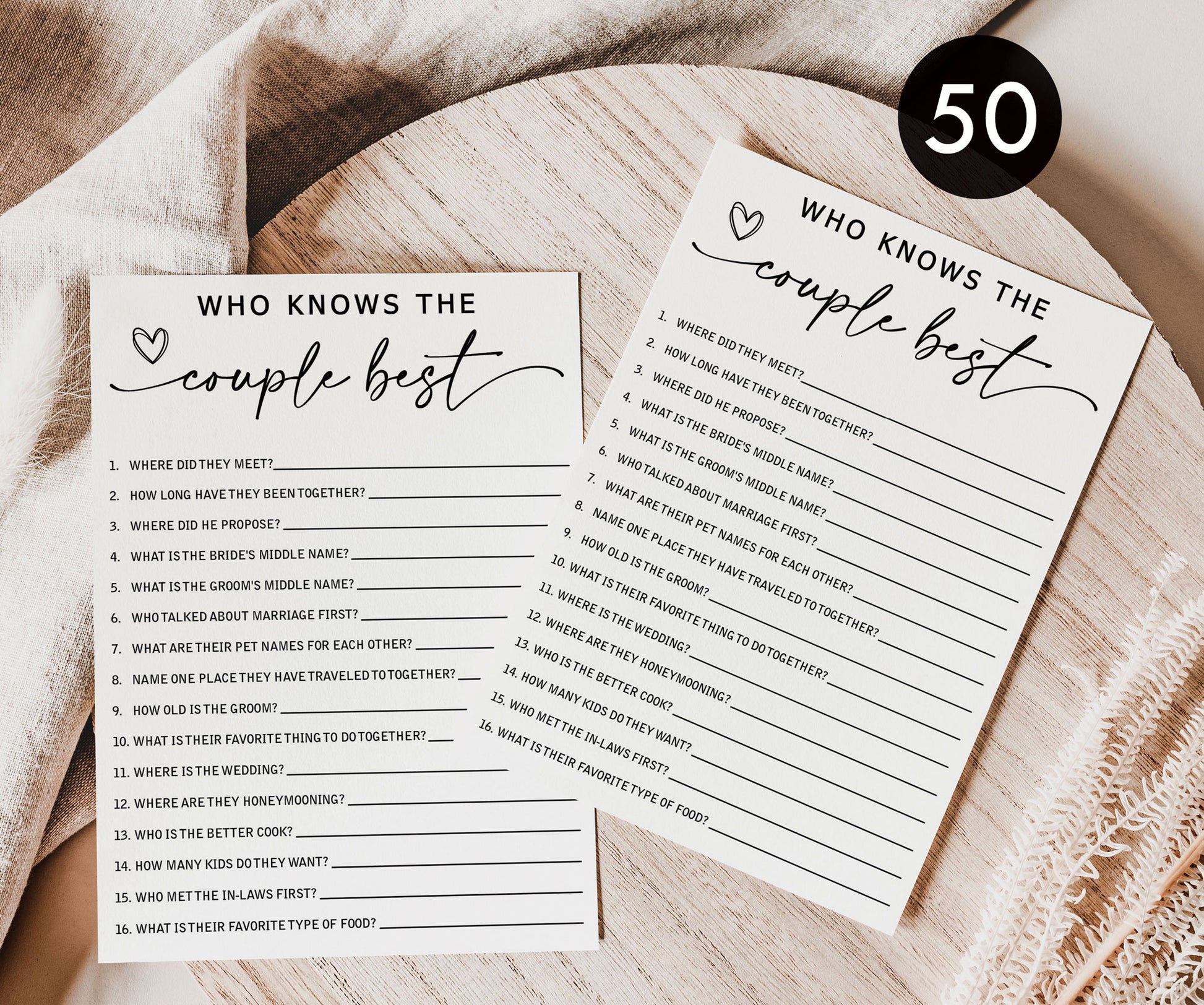 - FUN ACTIVITY - 50 Who Knows the Couple Best game cards. Funny Engagement Party, Wedding, Bachelorette or Bridal Shower Game.